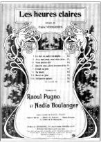 Les Heures claires , also a product of Boulanger’s twenty-second year, is a cycle of eight settings of poems by Émile Verhaeren. They were published by Heugel in 1910, and the handsome art nouveau cover of the sheet music is reproduced in the booklet (along with some rarely seen photos of the young Nadia herself). The music is jointly credited to “Raoul Pugno et Nadia Boulanger”. Pugno was a celebrated piano virtuoso, thirty-five years Boulanger’s senior.